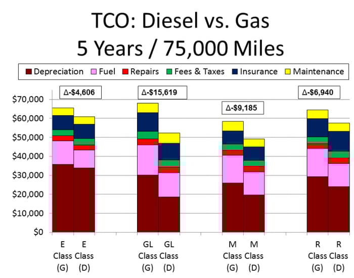 When comparing the gas version of a vehicle to a diesel version the average total cost of ownership TCO was between 2000- 5000 less for diesel owners. This means youll go farther per tank of. The fuel efficiency comes first to mind when choosing a major engine type for your fleet.